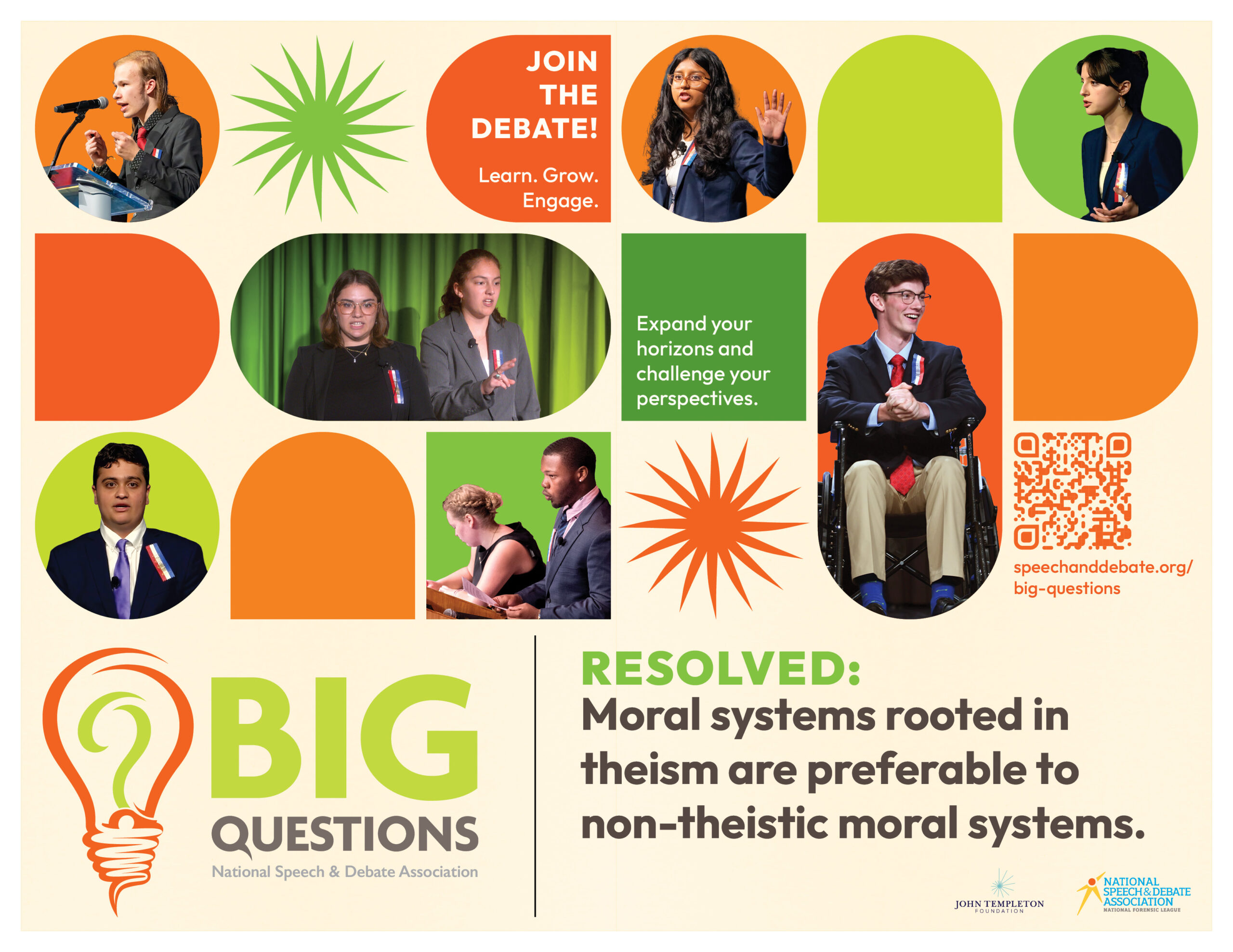 The Big Questions topic for the 2025-2026 season is, Resolved: Moral systems rooted in theism are preferable to non-theistic moral systems.