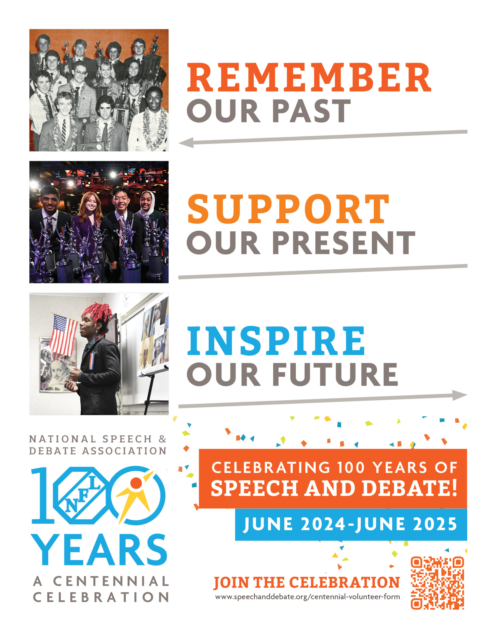 Centennial Poster Download: Celebrating 100 Years of Speech and Debate! Download a copy of our Centennial Poster! Share your message with 3,500 High Schools 600 Middle Schools 5,200 Coaches 140,000 Students Extend your reach at the Nationals 7,000 Attendees 6,500 Tournament Books are Distributed to Coaches and Teachers 7,000 Access the National Tournament App from their Phone or Device We can design your ad! It’s quick, easy, and affordable. For $125, we will create a beautiful, print-ready ad just for you!