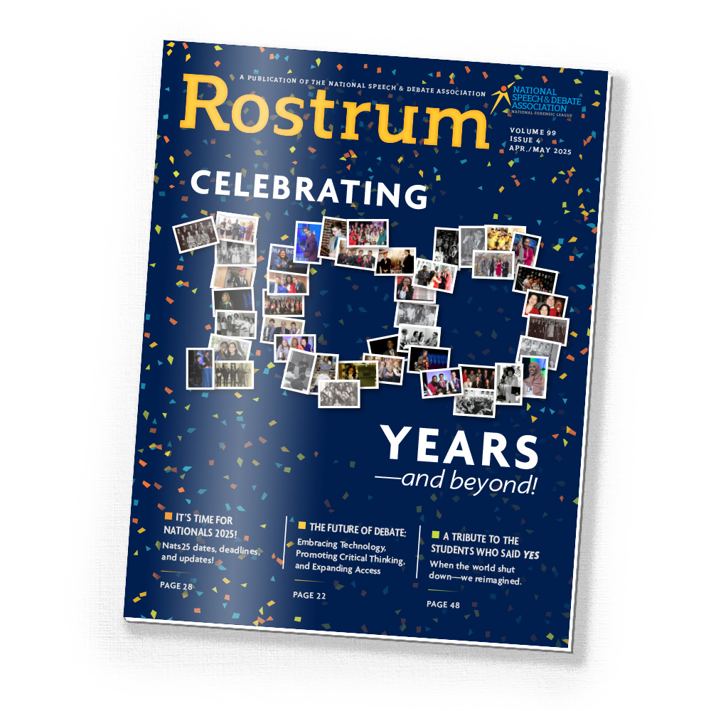 Our Centennial Celebration continues with a look back on 25 years of Academic All American awards. We pay tribute to the vital role of speech and debate education in our NSDE Day recap. Cindi and Aaron Timmons make the case for embracing technology, promoting critical thinking, and expanding access to support the future of debate. Zach Prax outlines the process for selecting final round judges at Nationals and how coaches can get involved. Plus, we detail the one-year pilot program that will allow up to 25% of districts to test alternative National Tournament qualification methods next year. We honor another slate of Faces in the Crowd and congratulate the list of 2025-2026 Student Leadership Council nominees. And we feature more heartwarming stories from our members, including Mfaz Mohamed Ali, Molly McDermott, and Marcus Viney.
