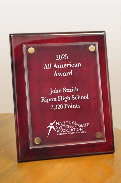 The top 25 student members of the National Speech & Debate Association can purchase our distinguished All American Award. The award will be personalized with your name, school, point total, and year of achievement.